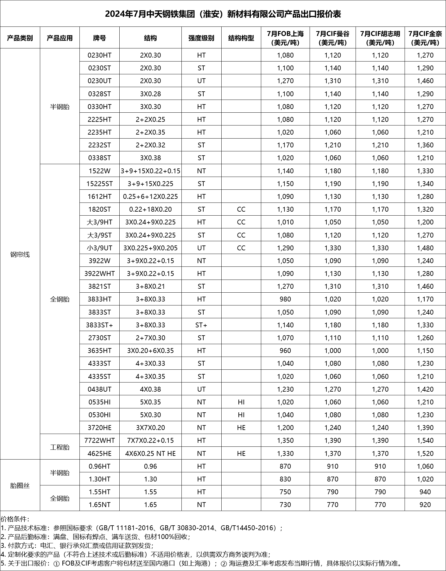 中天(淮安)钢帘线产品出口报价表(2024.7)