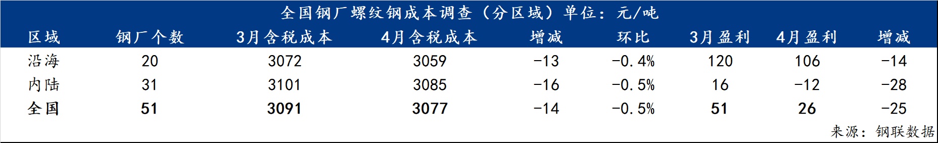 螺纹钢方面,4月底对全国51家螺纹钢生产企业调研了解到,螺纹钢平均成本为3077元/吨,环比下降14元/吨,降幅0.5%;分区域来看,沿海地区20家钢厂螺纹钢平均成本为3059元/吨,环比减少13元/吨,降0.4%;内陆地区31家钢厂螺纹钢平均成本为3085元/吨,环比减少16元/吨,降幅0.5%;盈利空间方面,4月份螺纹钢生产企业盈利空间在26元/吨,环比减少25元/吨。