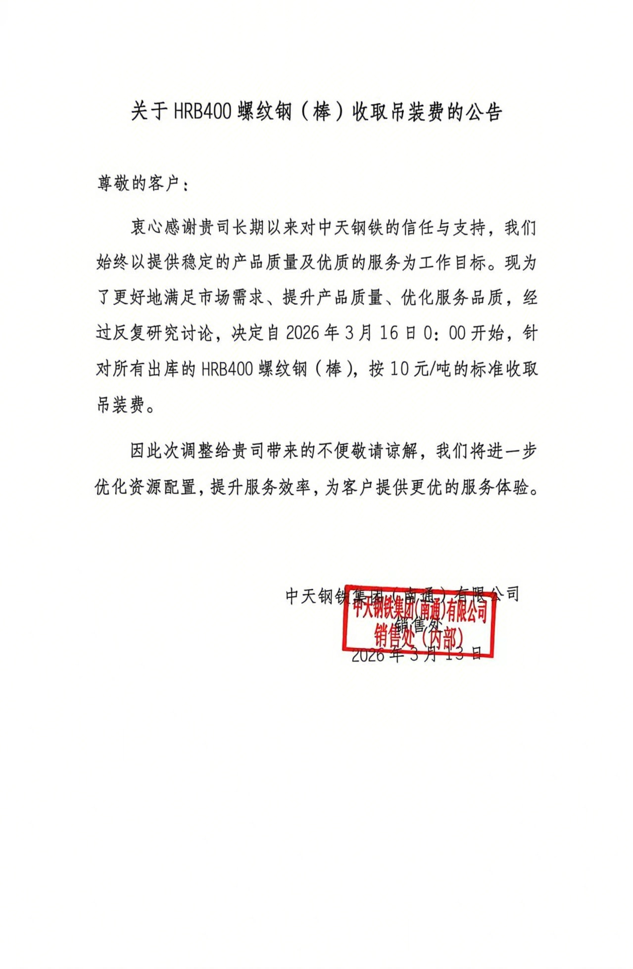 Mysteel快讯:中天钢铁HRB400螺纹钢(棒)收取吊装费的公告