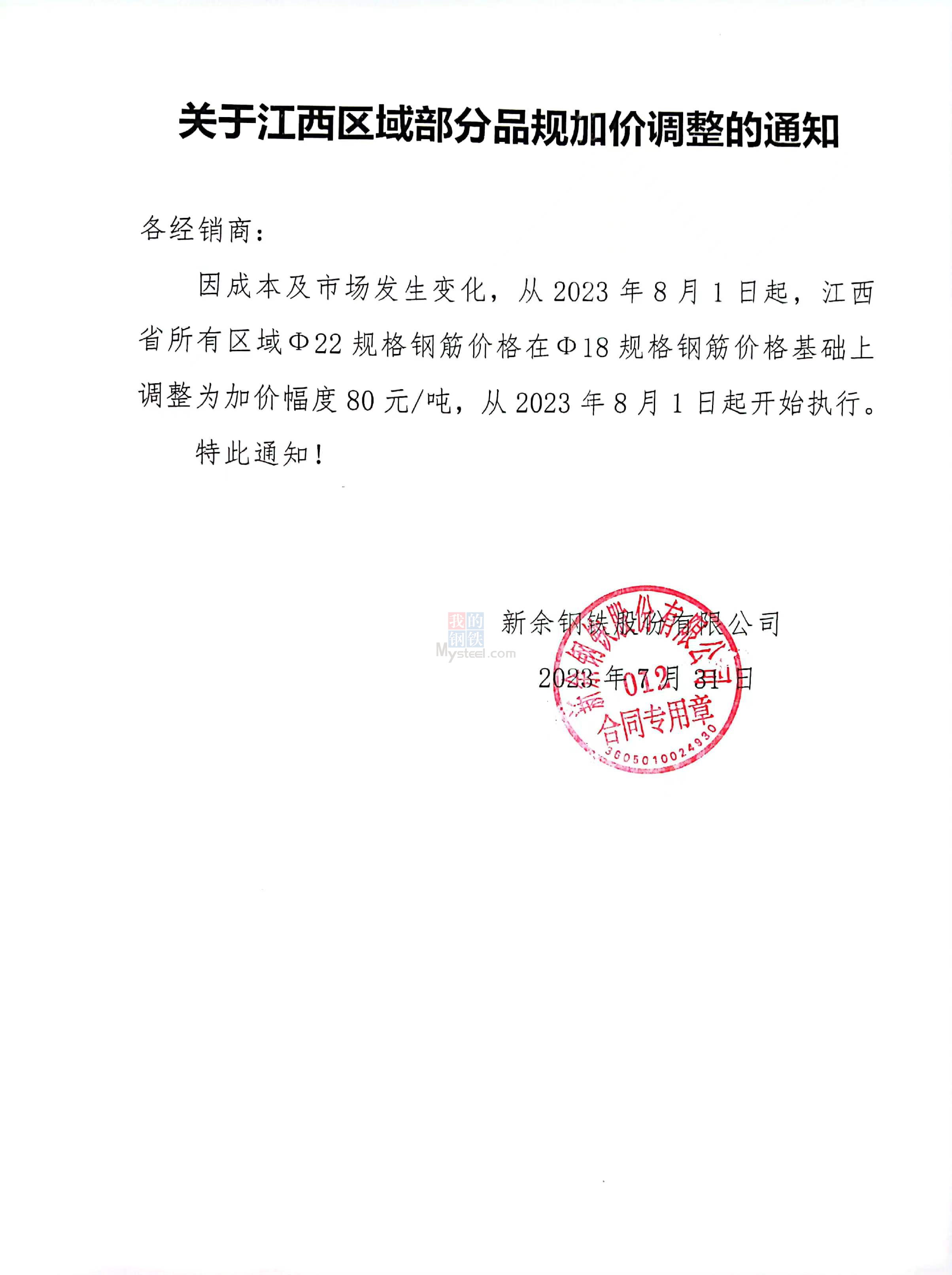 Mysteel:关于新钢对江西区域部分品规加价调整的通知