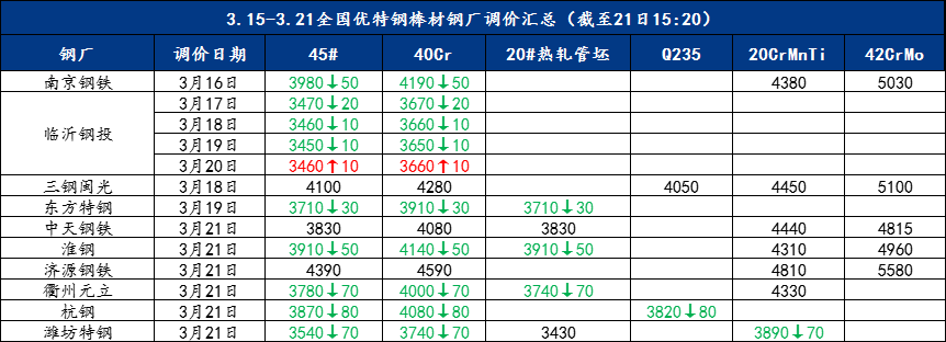 Mysteel快讯:全国优特钢棒材钢厂调价汇总(3.15-3.21)