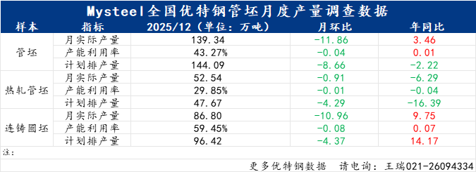 Mysteel数据:2025年12月全国管坯钢厂生产情况调研