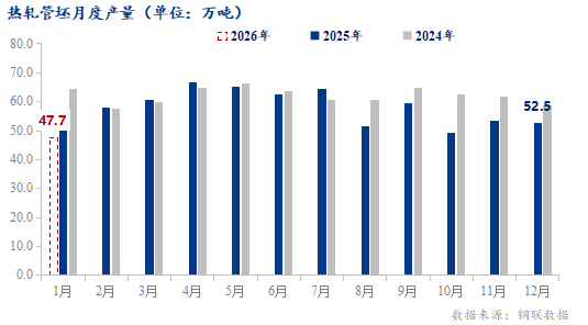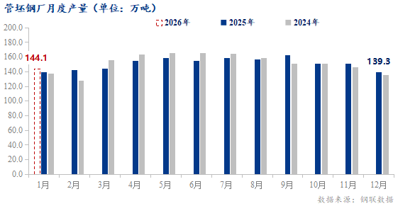 12月管坯钢厂实际生产139.34万吨,2026年1月预计产量144.09万吨,本期受钢厂检修影响,产量下滑,一月钢厂陆续复产,但仍为回归正常水平。