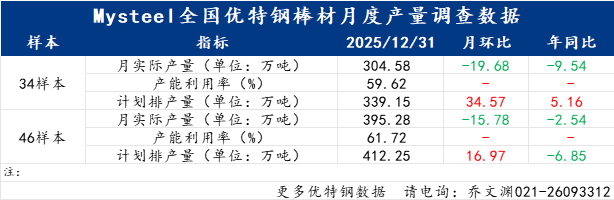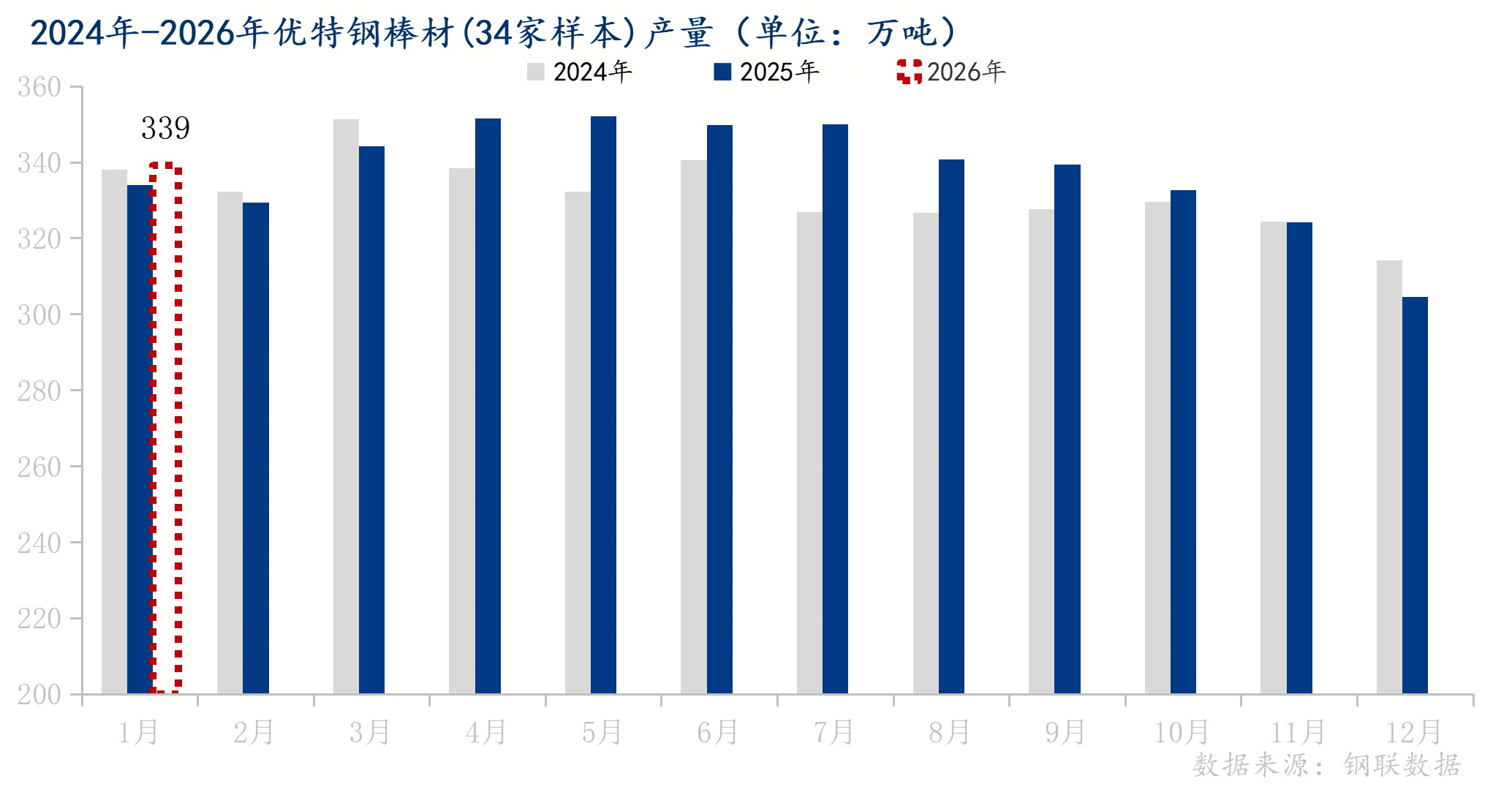 12月全国优特钢棒材(34家样本)产量304.58万吨,环比减少19.68万吨,同比减少9.54万吨;1月预计产量339.15万吨,环比增加34.57万吨,同比增加5.16万吨。