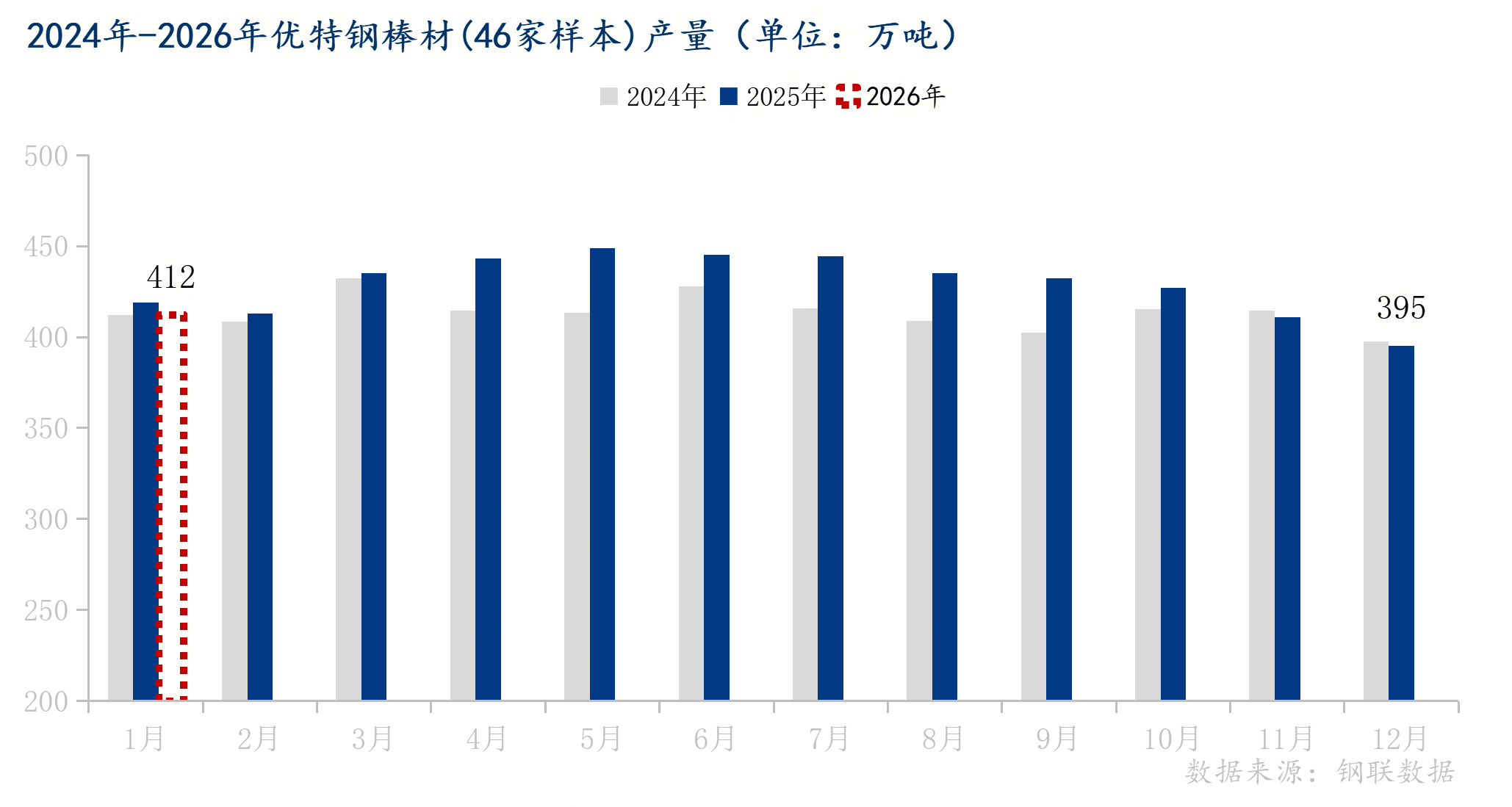 12 月全国优特钢棒材(46家样本)产量395.28万吨,环比减少15.78万吨,同比减少2.54万吨;1月预计产量412.25万吨,环比增加16.97万吨,同比减少6.85万吨。