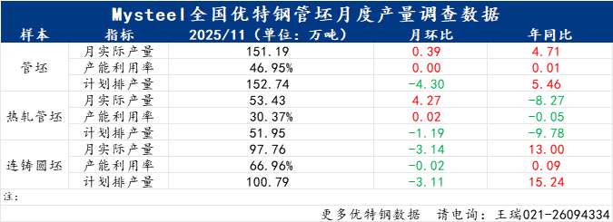Mysteel数据:2025年11月全国管坯钢厂生产情况调研