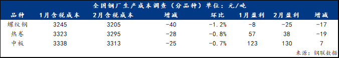 (1)2月底对全国主要样本高炉生产企业进行调查,其产品生产成本下降,幅度在30元/吨左右。数据显示,当前螺纹钢平均含税成本为3205元/吨,环比下降40元/吨,跌幅1.2%;热卷平均含税成本为3295元/吨,环比下跌28元/吨,跌幅0.8%;中厚板平均含税成本为3313元/吨,环比下跌25元/吨,跌幅0.7%。